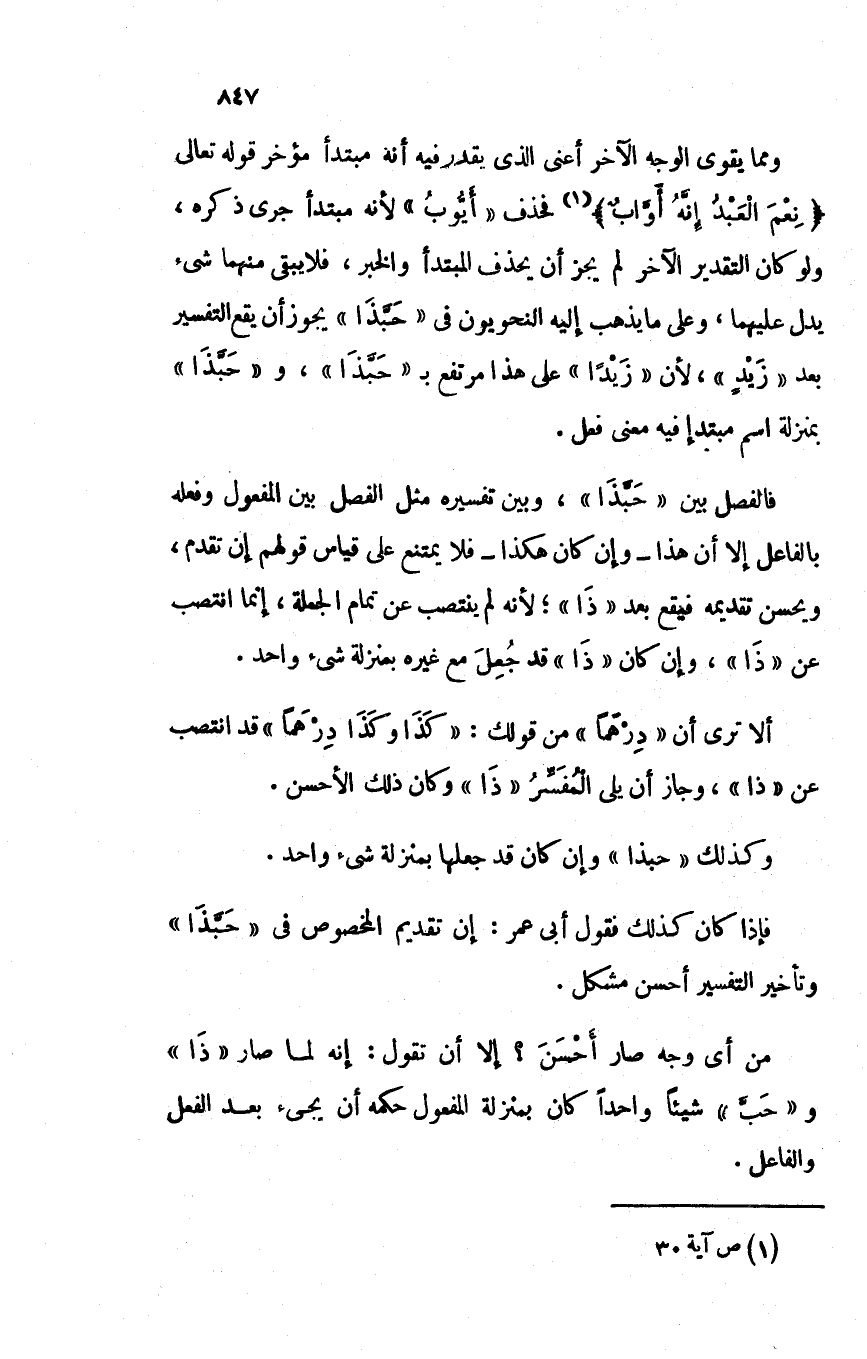 ومما يقوي الوجه الآخر أعني الذي يقدر فيه أنه مبتدأ مؤخر قوله تعالى (نعم العبدُ إنه أوابٌ) فحذف "أيوبُ" لأنه مبتدأ جرى ذكره، ولو كان التقدير الآخر لم يجز أن يحذف المبتدأ والخبر، فلا يبقى منهما شيء يدل عليهما، وعلى ما يذهب إليه النحويون في "حبذا" يجوز أن يقع التفسير بعد "زيدٍ"، لأن "زيداً" على هذا مرتفع بـ "حبذا"، و"حبذا" بمنزلة اسم مبتدأ فيه معنى فعل.