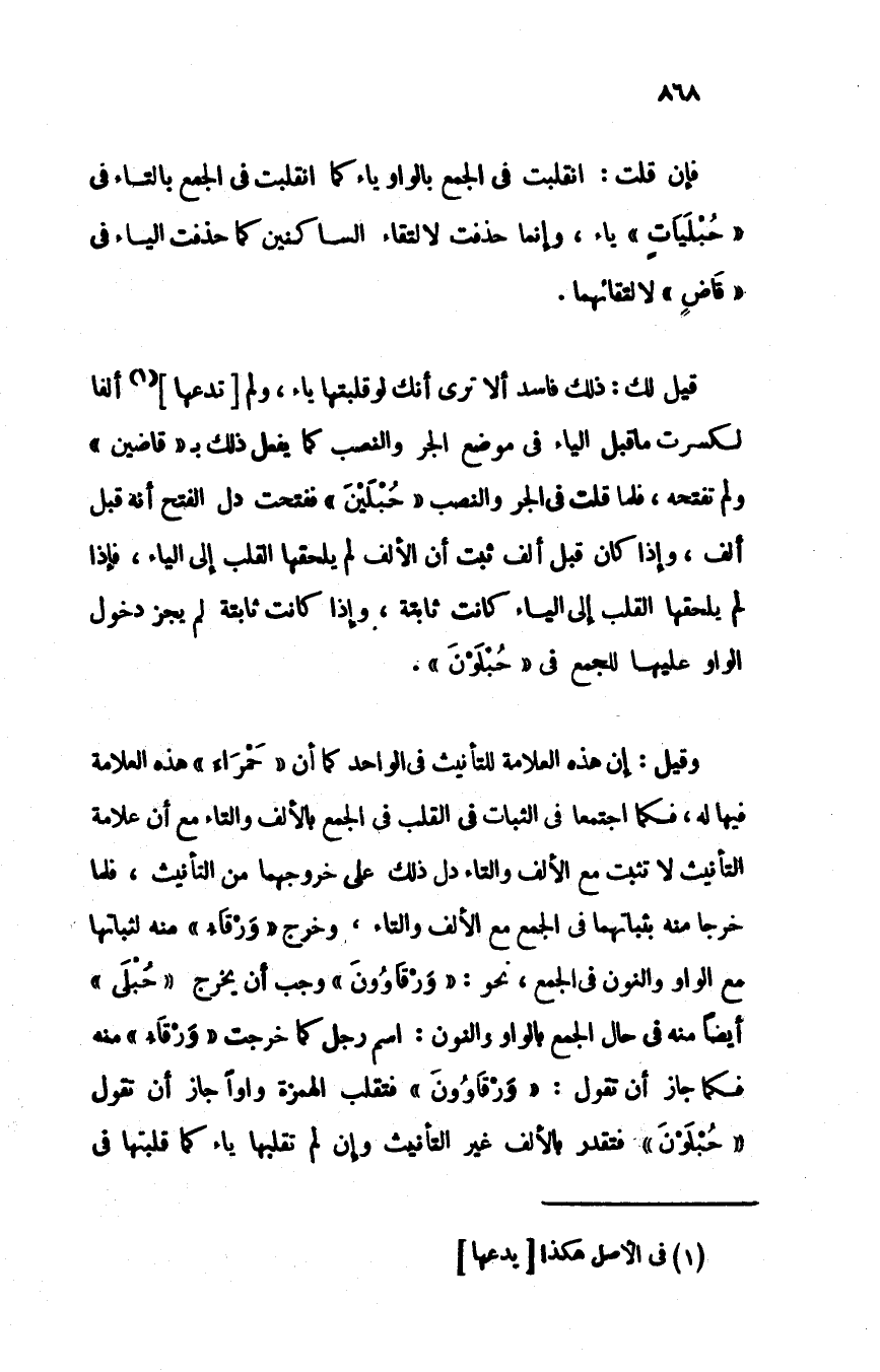 وقيل: إن هذه العلامة للتأنيث في الواحد كما أن "حمراء" هذه العلامة فيها له، فكما اجتمعا في الثبات في القلب في الجمع بالألف والتاء مع أن علامة التأنيث لا تثبت مع الألف والتاء دل ذلك على خروجهما من التأنيث، فلما خرجا منه بثباتهما في الجمع مع الألف والتاء، وخرج "ورقاء" منه لثباتها مع الواو النون في الجمع، نحو: "ورقاوون" وجب أن يخرج "حُبْلَى" أيضاً منه في حال الجمع بالواو والنون: اسم رجل كما خرجت "ورقاء" منه فكما جاز أن تقول: "ورقاوونَ" فتقلب الهمزة واواً جاز أن تقول "حُبْلَوْنَ" فتقدر بالألف غير التأنيث وإن لم تقلبها ياء كما قلبتها في