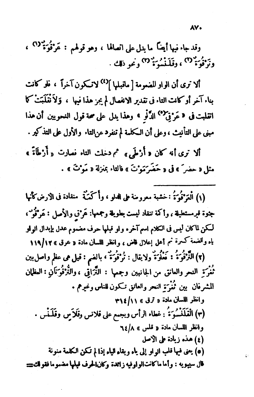وقد جاء فيها أيضاً ما يدل على اتصالها، وهو قولهم: "عرقوةٌ، وترقوةٌ، وقلنسوةٌ ونحو ذلك.