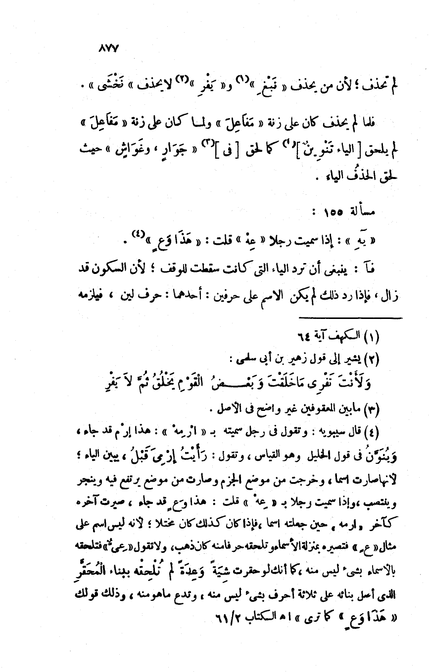 فلما لم يحذف كان على زنة "مفاعِلَ" ولما كان على زنة "مفاعِلَ" لم يلحق [الياء تنوينٌ] كما لحق [في] "جوارٍ، وغواشٍ" حيث لحق الحذفُ الياء.