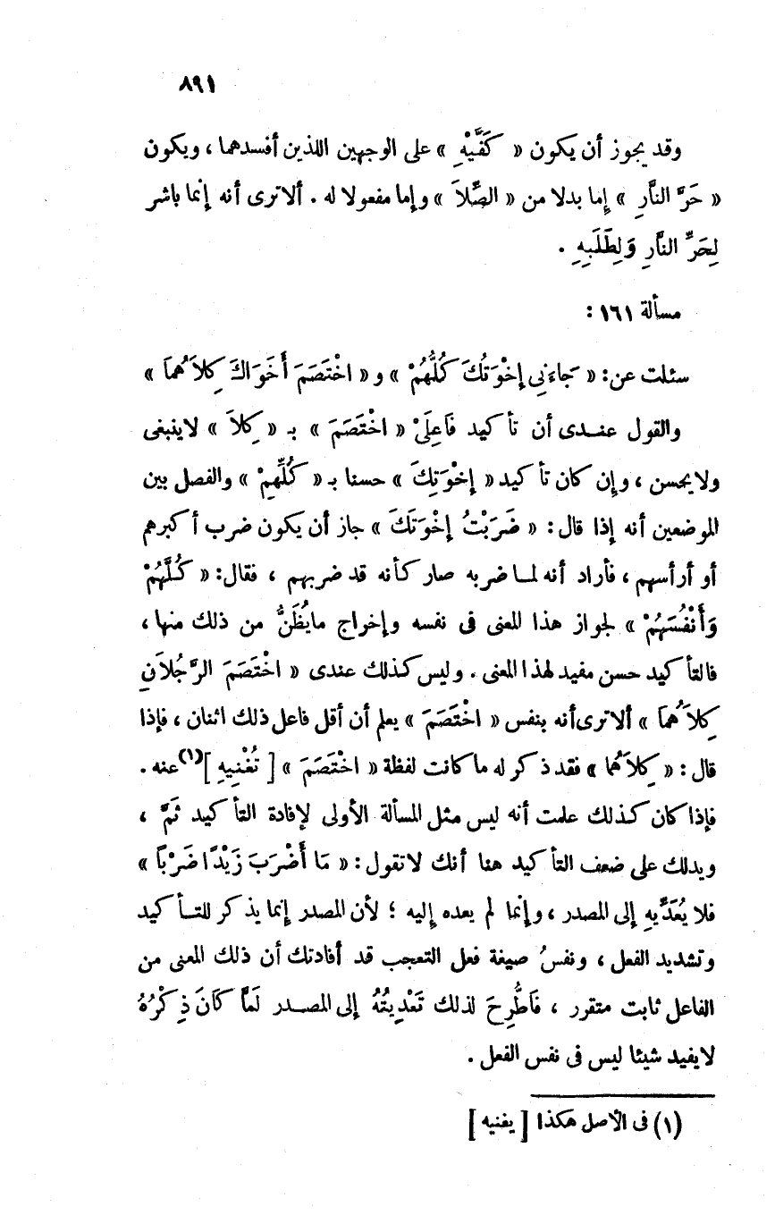 سئلت عن: "جاءني إخوتُكَ كلهمْ" و"اختصم أخواك كلاهما" والقول عندي أن تأكيد فاعليْ "اختصم" بـ"كلا" لا ينبغي ولا يحسن، وإن كان تأكيد "إخْوَتِكَ" حسنا بـ"كلهمْ" والفصل بين الموضعين أنه إذا قال: "ضربتُ إخْوَتَكَ" جاز أن يكون ضرب أكبرهم أو أرأسهم، فأراد أنه لما ضربه صار كأنه قد ضربهم، فقال: "كلهمْ وأنفسهمْ" لجواز هذا المعنى في نفسه وإخراج ما يظن من ذلك منها، فالتأكيد حسن مفيد لهذا المعنى. وليس كذلك عندي "اختصم الرجلانِ كلاهما" ألا ترى أنه بنفس "اختصم" يعلم أن أقل فاعل ذلك اثنان، فإذا قال: "كلاهما" فقد ذكر له ما كانت لفظة "اختصم" [تغنيهِ] عنه. فإذا كان كذلك علمت أنه ليس مثل المسألة الأولى لإفادة التأكيد ثم، ويدلك على ضعف التأكيد هنا أنك لا تقول: "ما أضرب زيداً ضرباً" فلا يُعديه إلى المصدر، وإنما لم يعده إليه؛ لأن المصدر إنما يذكر للتأكيد وتشديد الفعل، ونفسُ صيغة فعل التعجب قد أفادتك أن ذلك المعنى من الفاعل ثابت متقرر، فاطرح لذلك تعديته إلى المصدر لما كان ذكره لا يفيد شيئاً ليس في نفس الفعل.