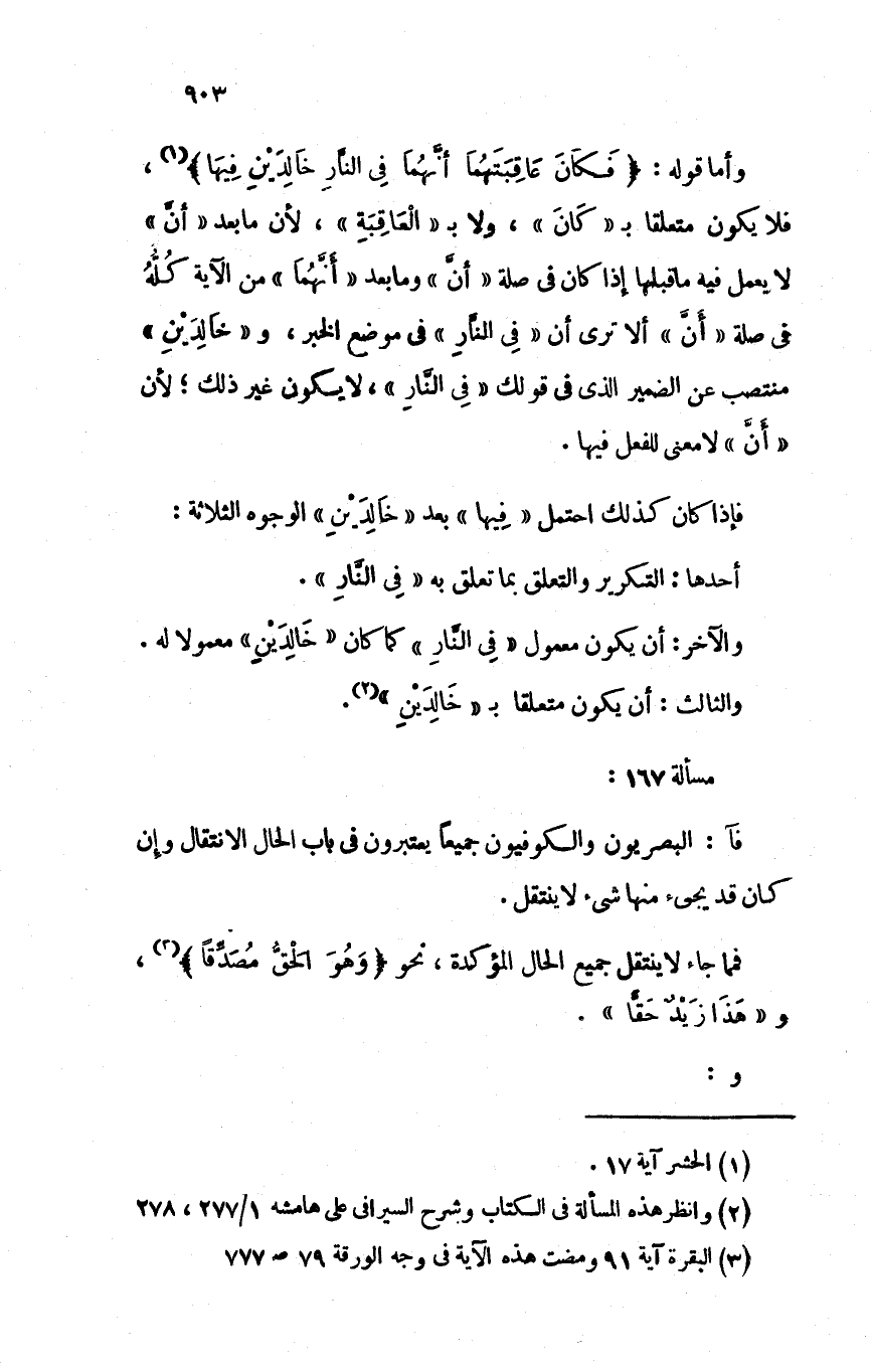 وأما قوله: (فكان عاقبتهما أنهما في النار خالدين فيها)، فلا يكون متعلقاً بـ "كان"، ولا بـ"العاقبةِ"، لأن ما بعد "أن" لا يعمل فيه ما قبله إذا كان في صلة "أن" وما بعد "أنهما" من الآية كلهُ في صلة "أنَّ" ألا ترى أن "في النار" في موضع الخبر، و"خالدين" منتصب عن الضمير الذي في قولك "في النار"، لا يكون غير ذلك؛ لأن "أن" لا معنى للفعل فيها.