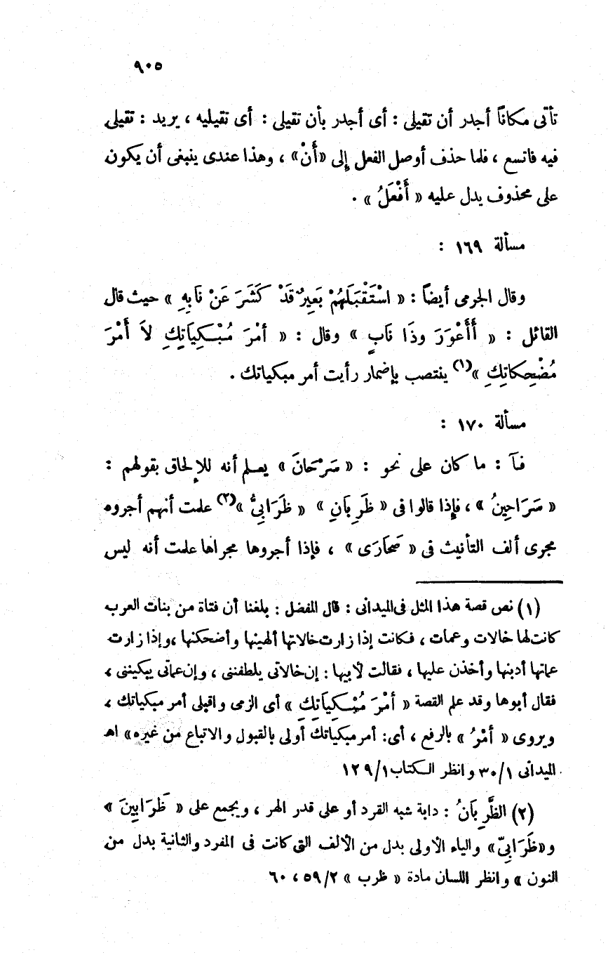 وقال الجرمي أيضاً: "استقبلهم بعيرٌ قد كشر عن نابه" حيث قال القائل: "أأعور وذا نابٍ" وقال: "أمر مُبْكياتك لا أمر مضحكاتك" ينتصب بإضمار رأيت أمر مبكياتك.