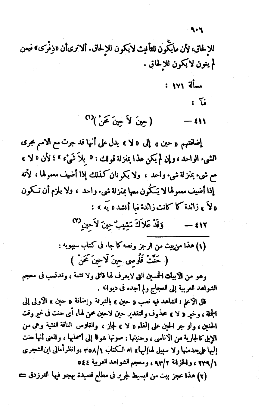 إضافتهم "حين" إلى "لا" يدل على أنها قد جرت مع الاسم مجرى الشيء الواحد، وإن لم يكن هذا بمنزلة قولك: "بلا شيء"؛ لأن "لا" مع شيء بمنزلة شيء واحد، ولا يكونان كذلك إذا أضيف معمولها، لأنه إذا أضيف معمولها لا يكون معها بمنزلة شيء واحد، ولا يلزم أن تكون "لا" زائدة كما كانت زائدة فيما فيما أنشد "يه":