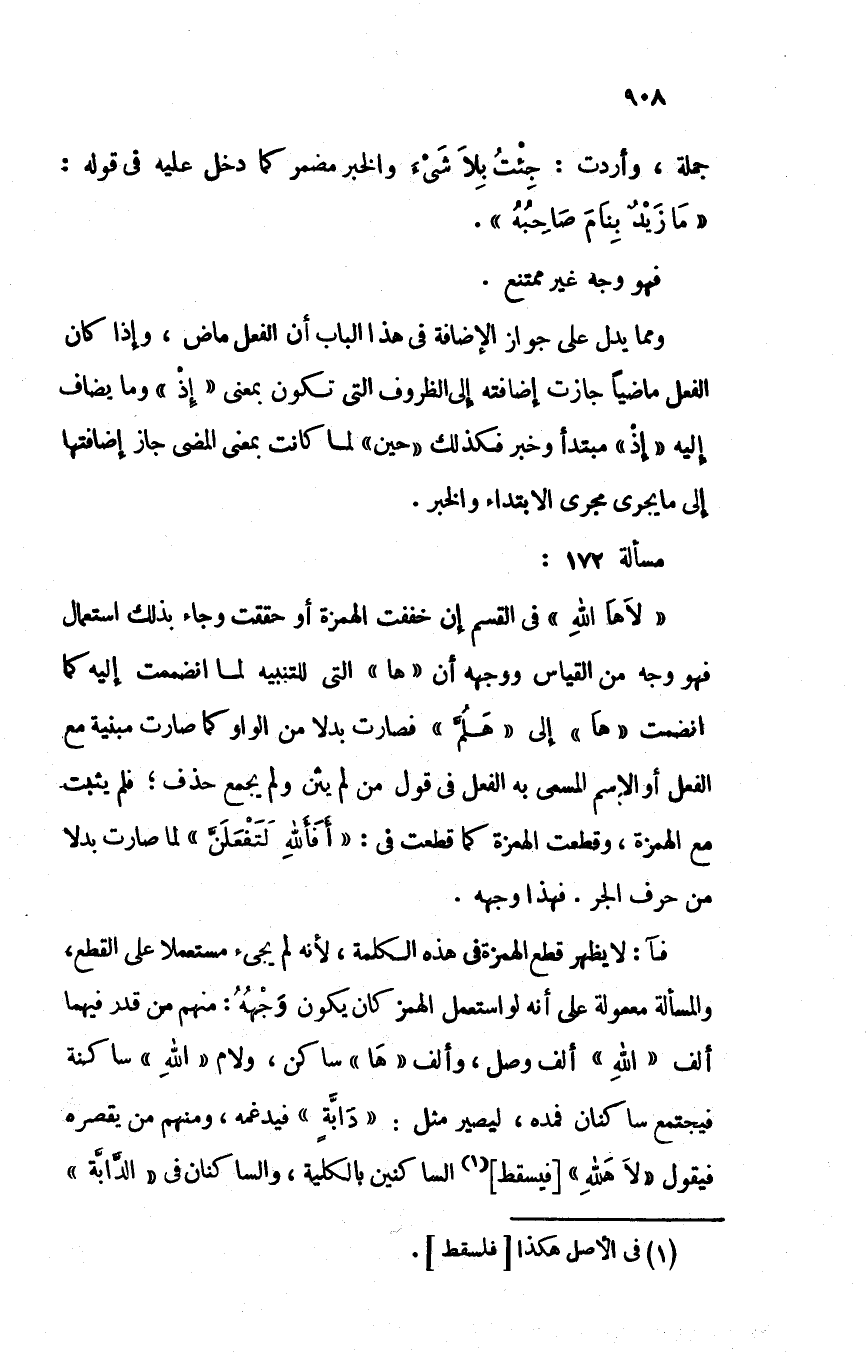 فآ: لا يظهر قطع الهمزة في هذه الكلمة، لأنه لم يجيء مستعملاً على القطع، والمسألة معمولة على أنه لو استعمل الهمز ك يكون وجهه: منهم من قدر فيهما ألف "الله" ألف وصل، وألف "ها" ساكن، ولام "الله" ساكنة فيجتمع ساكنان فمده، ليصير مثل: "دابةٍ" فيدغمه، ومنهم من يقصره فيقول "لا هـ لله" [فيسقط] الساكنين بالكلية، والساكنان في "الدابة"