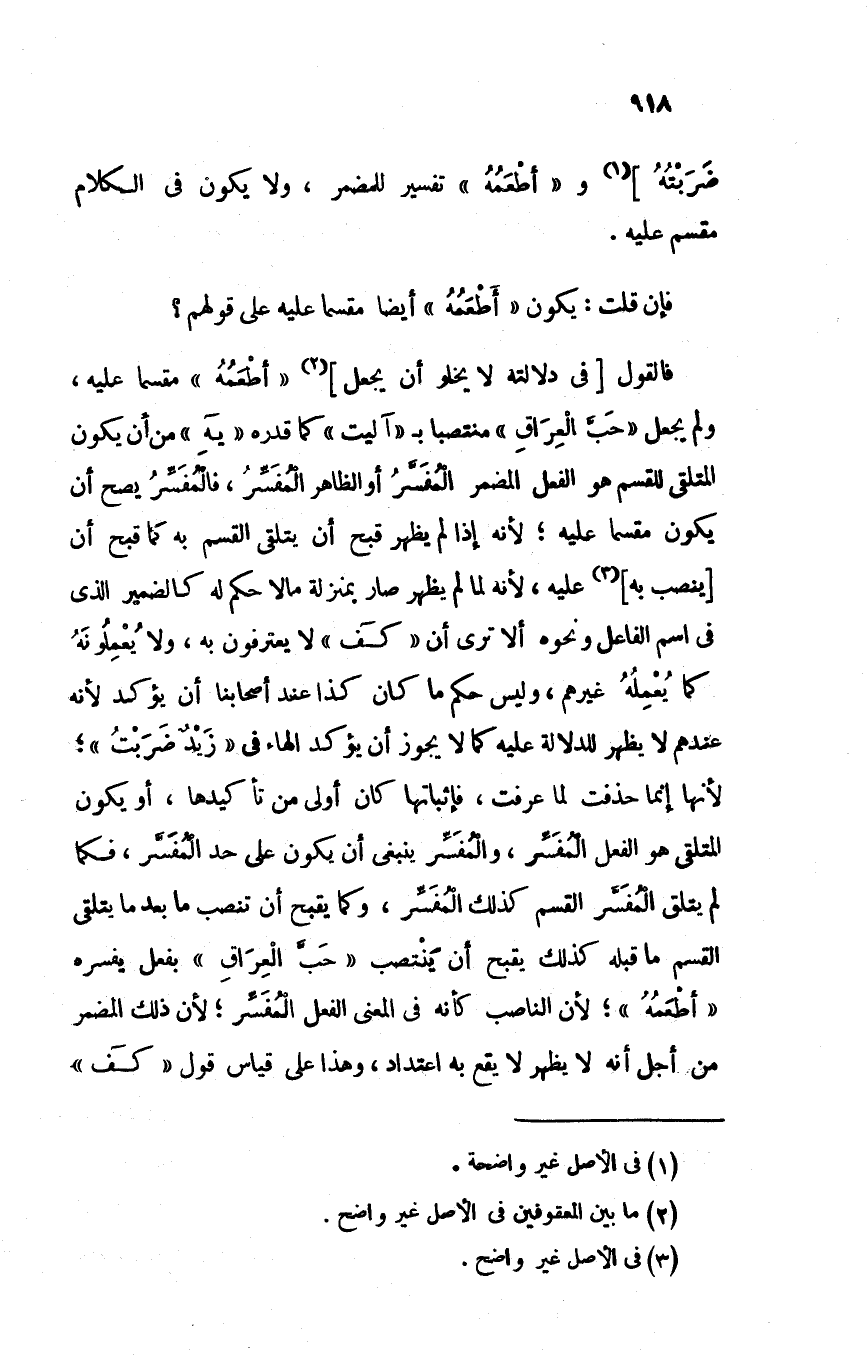 فالقول [في دلالته لا يخلو أن يجعل] "أطْعَمُهُ" مقسماً عليه، ولم يجعل "حب العراقِ" منتصباً بـ"آليت" كما قدره "يهِ" من أن يكون المتلقى للقسم هو الفعل المضمر المفسرُ أو الظاهر المفسرُ، فالمفسرُ يصح أن يكون مقسماً عليه؛ لأنه إذا لم يظهر قبح أن يتلقى القسم به كما قبح أن [ينصب به] عليه، لأنه لما لم يظهر صار بمنزلة مالا حكم له كالضمير الذي في اسم الفاعل ونحوه ألا ترى أن "كف" لا يعترفون به، لوا يعملونه كما يعمله غيرهم، وليس حكم ما كان كذا عند أصحابنا أن يؤكد لأنه عندهم لا يظهر للدلالة عليه كما لا يجوز أن يؤكد الهاء في "زيدٌ ضربتُ"؛ لأنها إنما حذفت لما عرفت، فإثباتها كان أولى من تأكيدها، أو يكون المتلقى هو الفعل المفسر، والمفسر ينبغي أن يكون على حد المفسر، فكما لم يتلق المفسر القسم كذلك المفسر، وكما يقبح أن تنصب ما بعد ما يتلقى القسم ما قبله كذلك يقبح أن ينتصب "حب العراق" بفعل يفسره "أطعمه"؛ لأن الناصب كأنه في المعنى الفعل المفسر؛ لأن ذلك المضمر من أجل انه لا يظهر لا يقع به اعتداد، وهذا على قياس قول "كف"