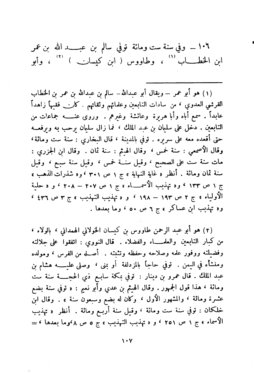وفي سنة ست ومائة توفي سالم بن عبد الله بن عمر ابن الخطاب، وطاووس ابن كيسان، وأبو