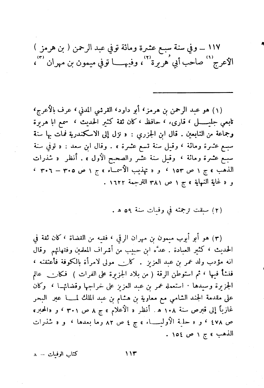وفي سنة سبع عشرة ومائة توفي عبد الرحمن بن هرمز الأعرج صاحب أبي هريرة، وفيها توفي ميمون بن مهران،