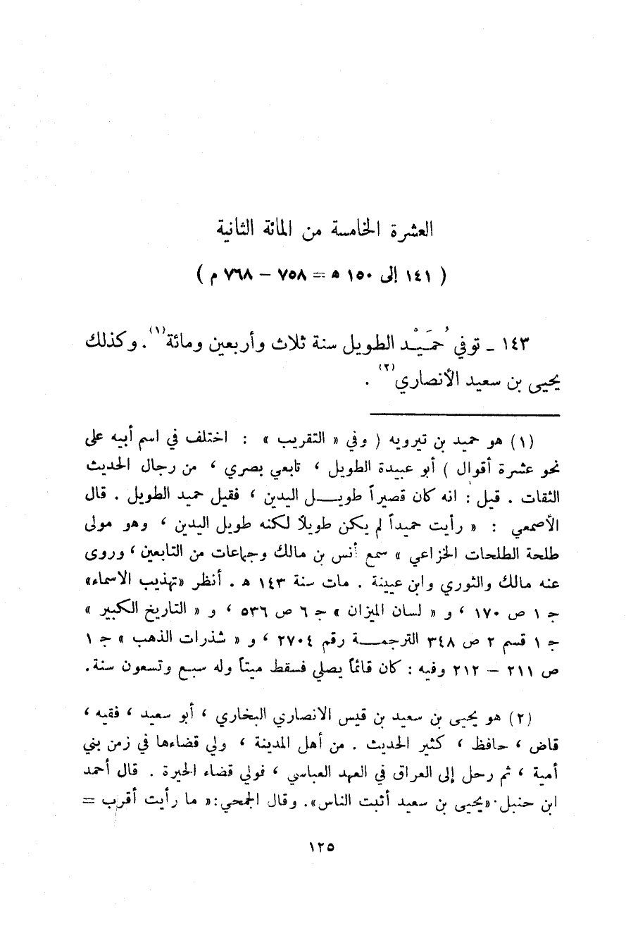 141 - إلى 150هـ، 758 - 768م توفي حميد الطويل سنة ثلاث وأربعين ومائة. وكذلك يحيى بن سعيد الأنصاري.