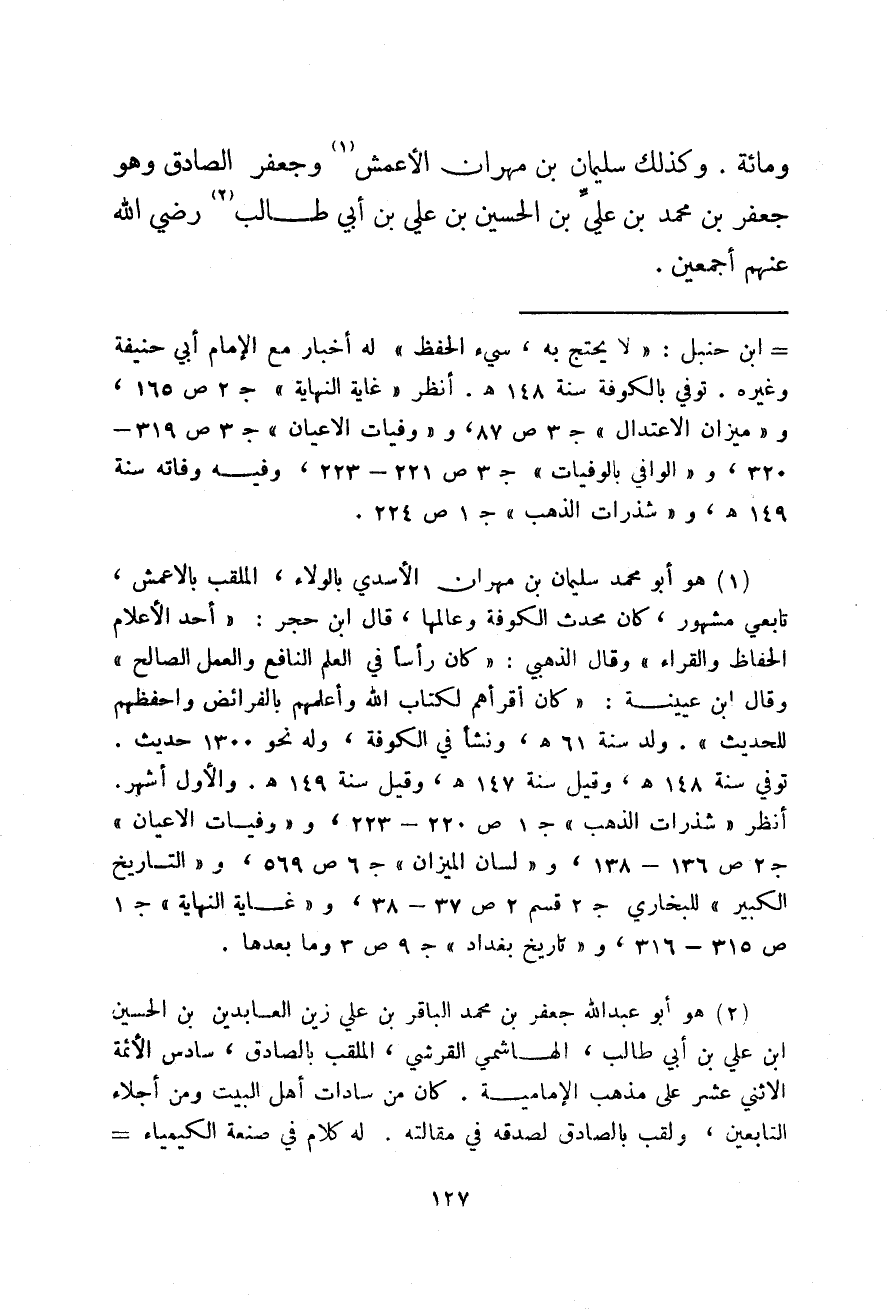 ومائة. وكذلك سليمان بن مهران الأعمش وجعفر الصادق وهو جعفر بن محمد بن علي بن الحسين بن علي بن أبي طالب رضي الله عنهم أجمعين.