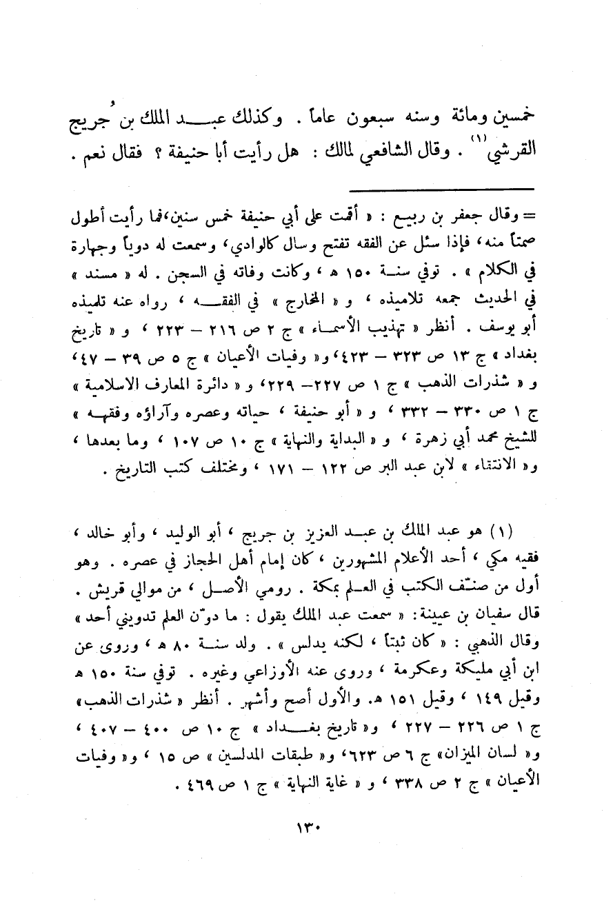 خمسين ومائة وسنه سبعون عاماً. وكذلك عبد الملك بن جريج القرشي. وقال الشافعي لمالك: هل رأيت أبا حنيفة؟ فقال نعم.