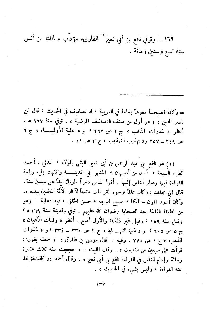 وتوفي نافع بن أبي نعيم القارئ مؤدب مالك بن أنس سنة تسع وستين ومائة.