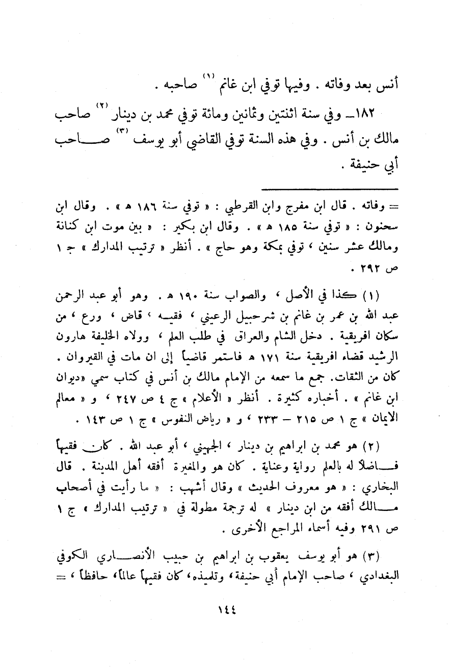 وفي سنة اثنتين وثمانين ومائة توفي محمد بن دينار صاحب مالك بن أنس. وفي هذه السنة توفي القاضي أبو يوسف صاحب أبي حنيفة.