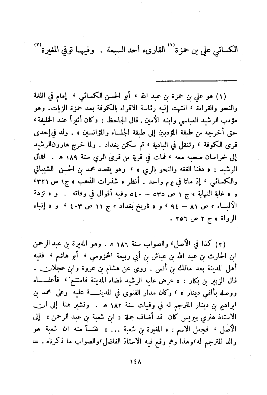 الكسائي علي بن حمزة القارئ أحد السبعة. وفيها توفي المغيرة.
