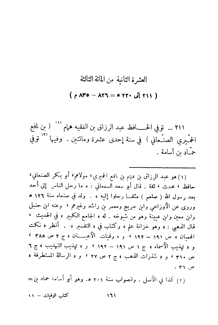 211 - إلى 220هـ، 826 - 835 م توفي الحافظ عبد الرزاق بن الفقيه همام بن نافع الحميري الصنعاني في سنة إحدى عشرة ومائتين. وفيها توفي حماد بن أسامة.