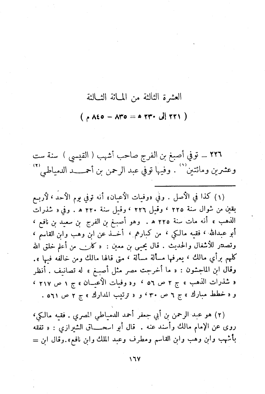 221 - إلى 230هـ، 835 - 845م توفي أصبغ بن الفرج صاحب أشهب القيسي سنة ست وعشرين ومائتين. وفيها توفي عبد الرحمن بن أحمد الدمياطي