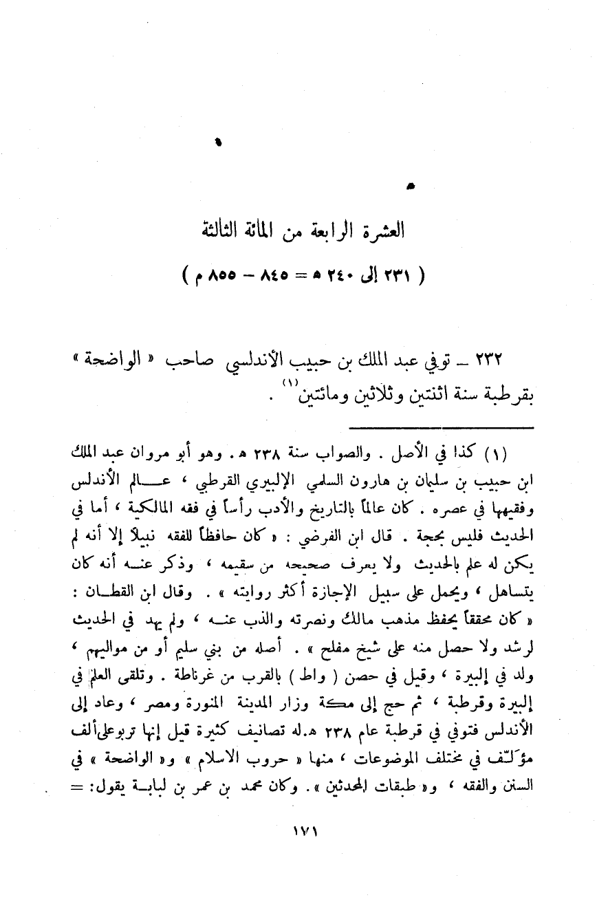 231 - إلى 240هـ، 845 - 855م توفي عبد الملك بن حبيب الأندلسي صاحب الواضحة بقرطبة سنة اثنيتن وثلاثين ومائتين.