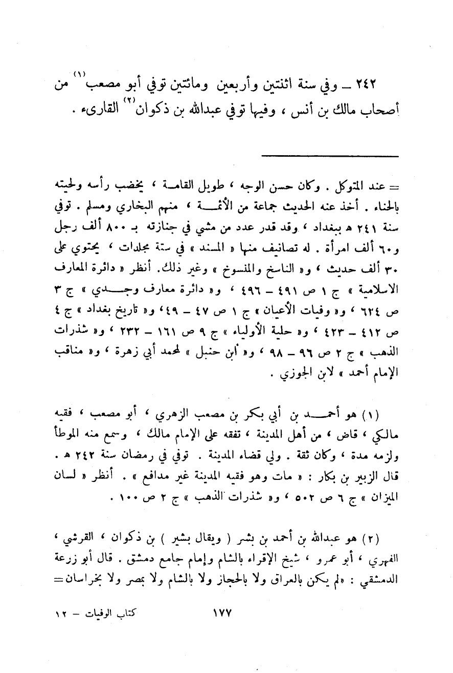 وفي سنة اثنتين وأربعين ومائتين توفي أبو مصعب من أصحاب مالك بن أنس، وفيها توفي عبد الله بن ذكوان القارئ.