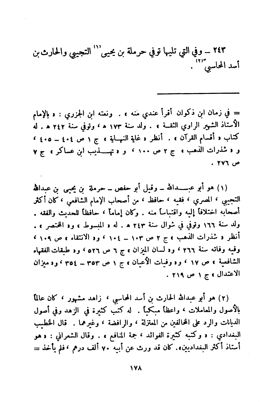 وفي التي تليها توفي حرملة بن يحيى التجيبي والحارث بن أسد المحاسبي.