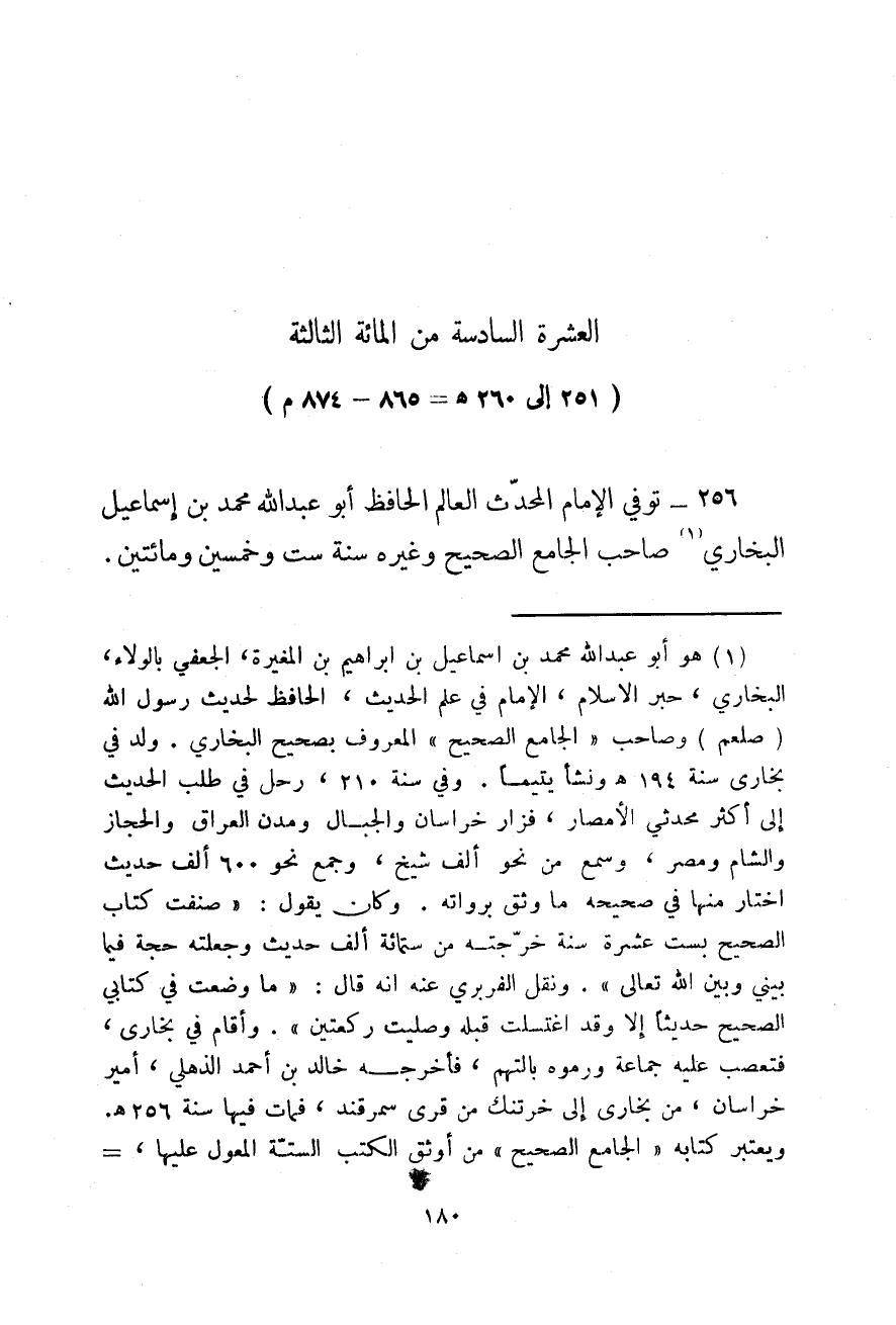 251 - إلى 260هـ، 865 - 874م توفي الإمام المحدث العالم الحافظ أبو عبد الله محمد بن إسماعيل البخاري صاحب الجامع الصحيح وغيره سنة ست وخمسين ومائتين.