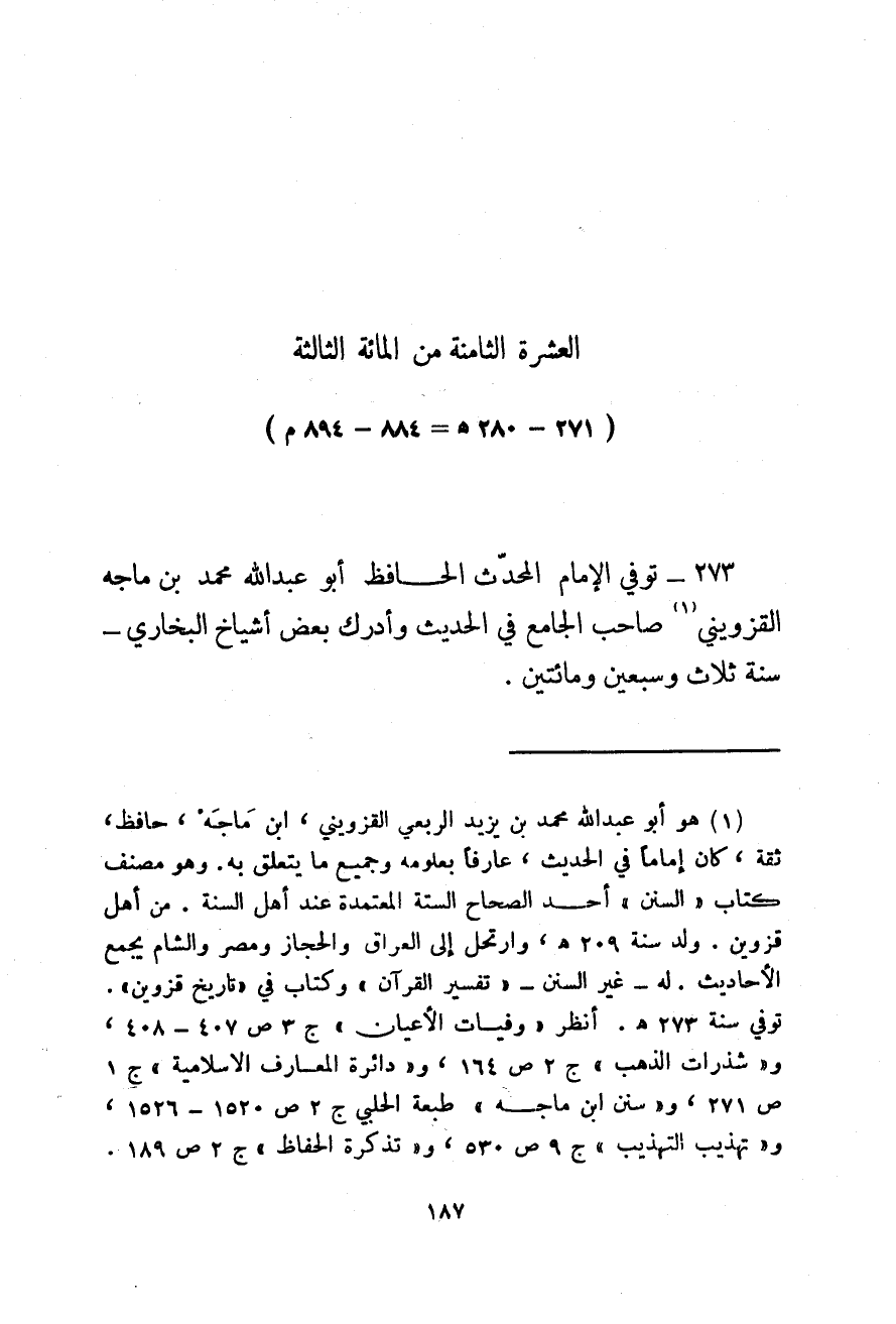 271 - 280هـ، 884 - 894م توفي الإمام المحدث الحافظ أبو عبد الله محمد بن ماجه القزويني صاحب الجامع في الحديث وأدرك بعض أشياخ البخاري سنة ثلاث وسبعين ومائتين.