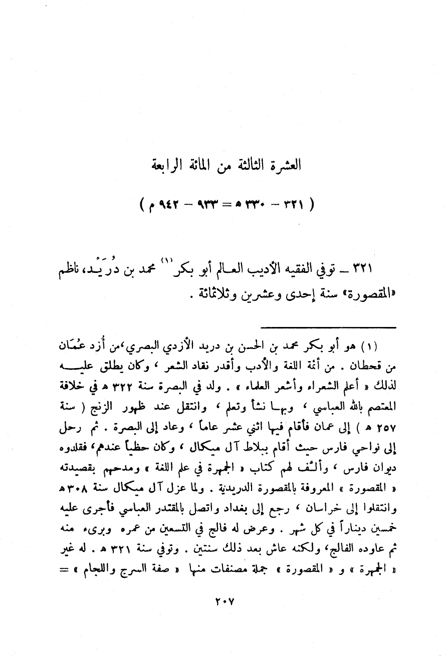 321 - 330هـ، 933 - 942م توفي الفقيه الأديب العالم أبو بكر محمد بن دريد، ناظم المقصورة سنة إحدى وعشرين وثلاثمائة.