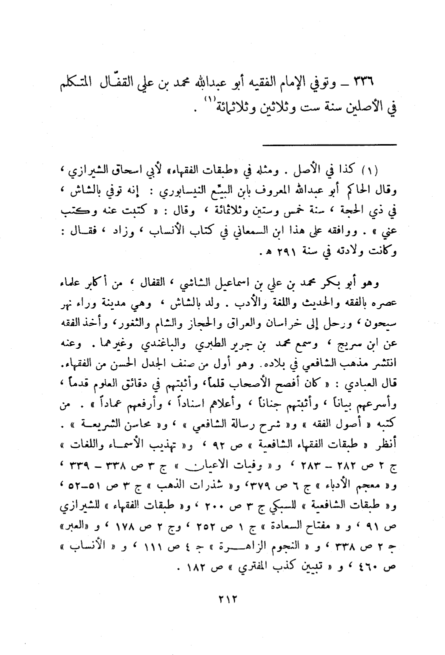 وتوفي الإمام الفقيه أبو عبد الله محمد بن علي القفال المتكلم في الأصلين سنة ست وثلاثين وثلاثمائة.