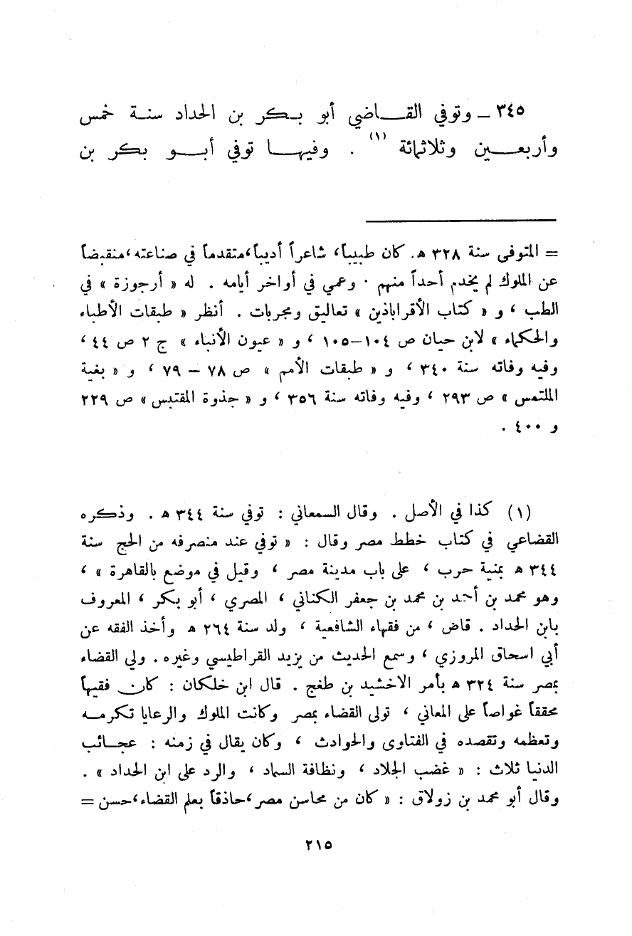 وتوفي القاضي أبو بكر بن الحداد سنة خمس وأربعين وثلاثمائة. وفيها توفي أبو بكر بن