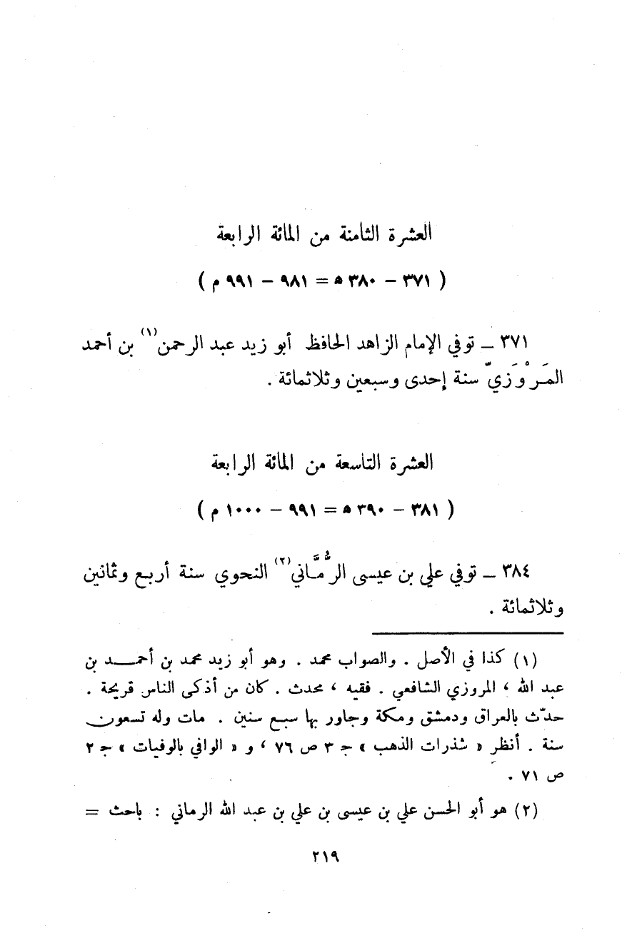 371 - 380هـ، 981 - 991م توفي الإمام الزاهد الحافظ أبو زيد عبد الرحمن بن أحمد المروزي سنة إحدى وسبعين وثلاثمائة.