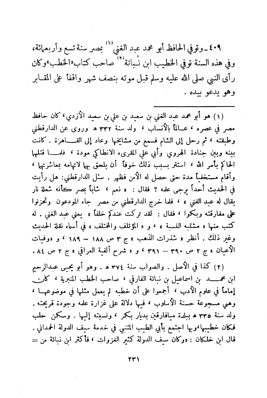 وتوفي الحافظ أبو محمد عبد الغني بمصر سنة تسع وأربعمائة، وفي هذه السنة توفي الخطيب ابن نباتة صاحب كتاب الخطب وكان رأى النبي صلى الله عليه وسلم قبل موته بنصف شهر واقفاً على المقابر وهو يدعو بيده.