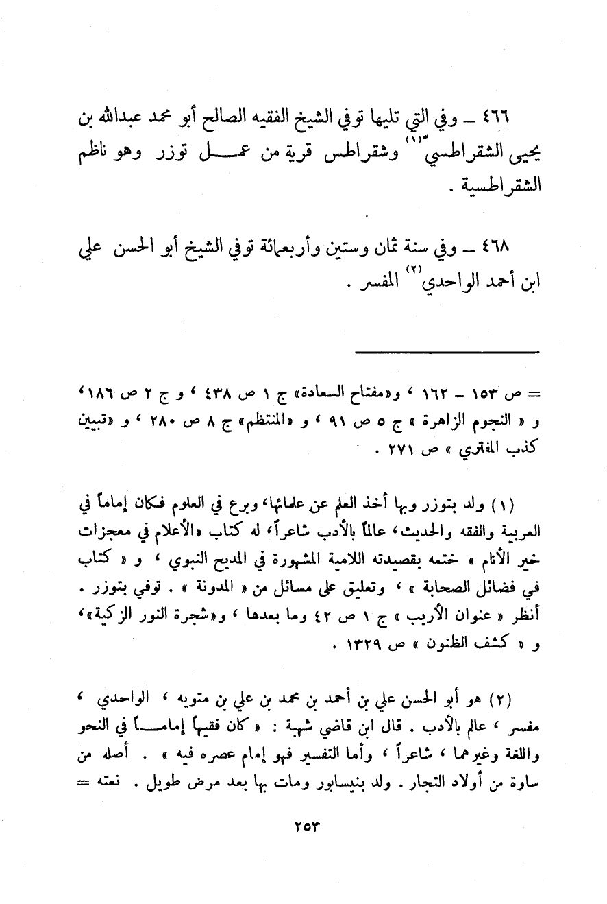وفي سنة ثمان وستين وأربعمائة توفي الشيخ أبو الحسن علي ابن أحمد الواحدي المفسر.