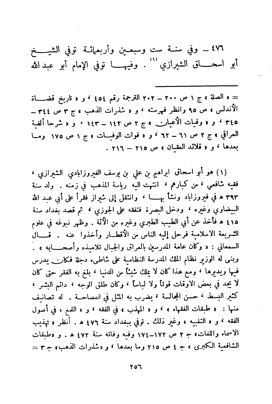 وفي سنة ست وسبعين وأربعمائة توفي الشيخ أبو إسحاق الشيرازي. وفيها توفي الإمام أبو عبد الله