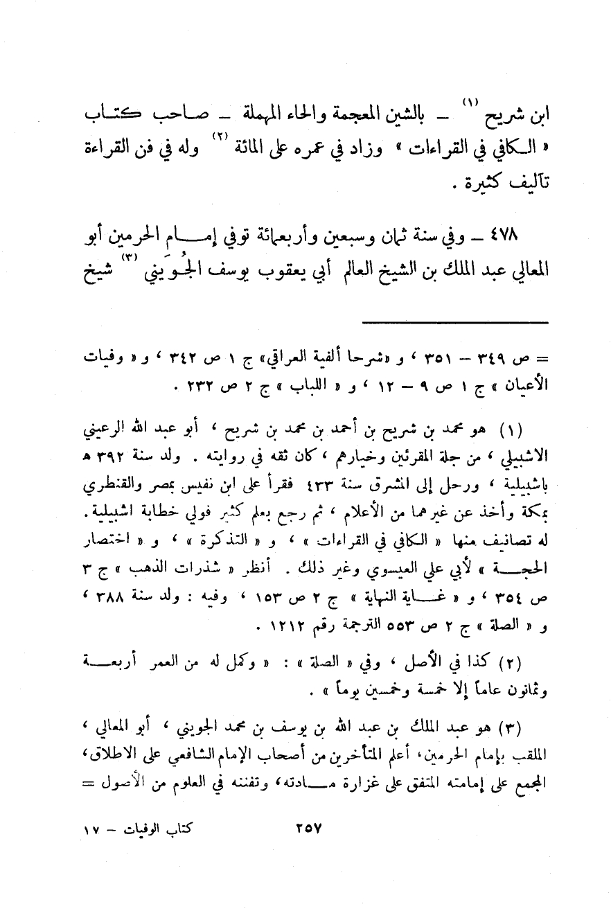 وفي سنة ثمان وسبعين وأربعمائة توفي إمام الحرمين أبو المعالي عبد الملك بن الشيخ العالم أبي يعقوب يوسف الجويني شيخ