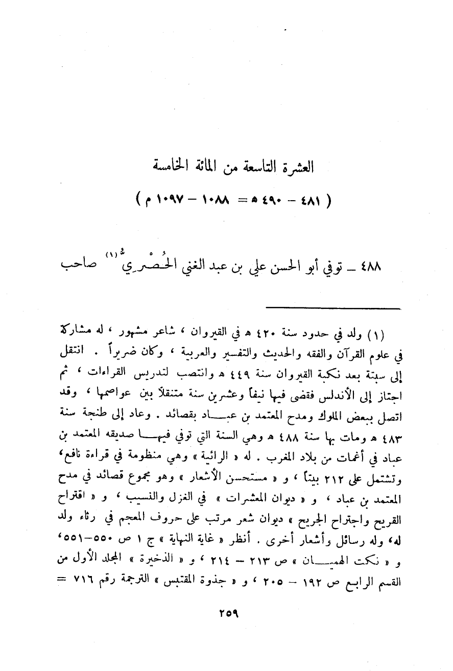481 - 490هـ، 1088 - 1097م توفي أبو الحسن علي بن عبد الغني الحصري صاحب