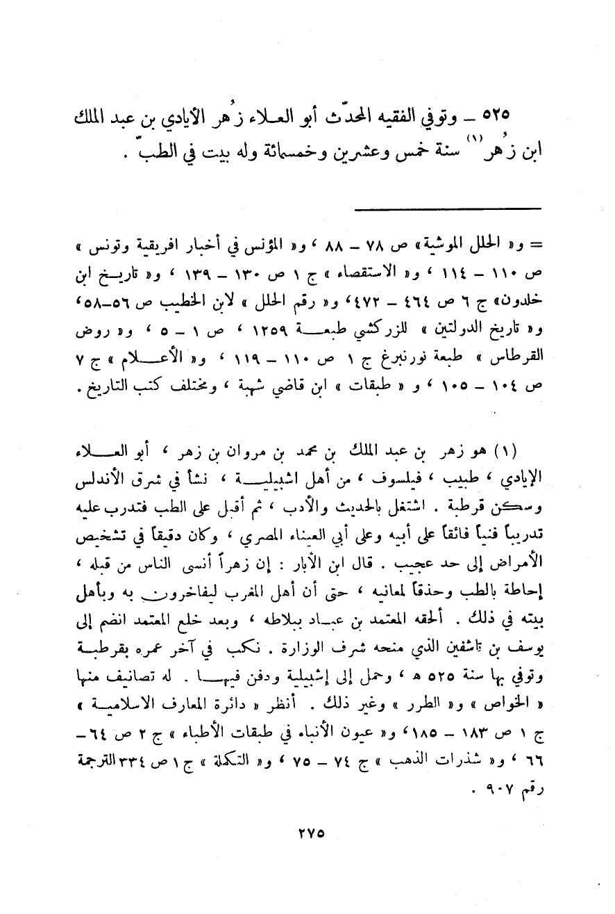 وتوفي الفقيه المحدث أبو العلاء زهر الأيادي بن عبد الملك ابن زهر سنة خمس وعشرين وخمسمائة وله بيت في الطب.
