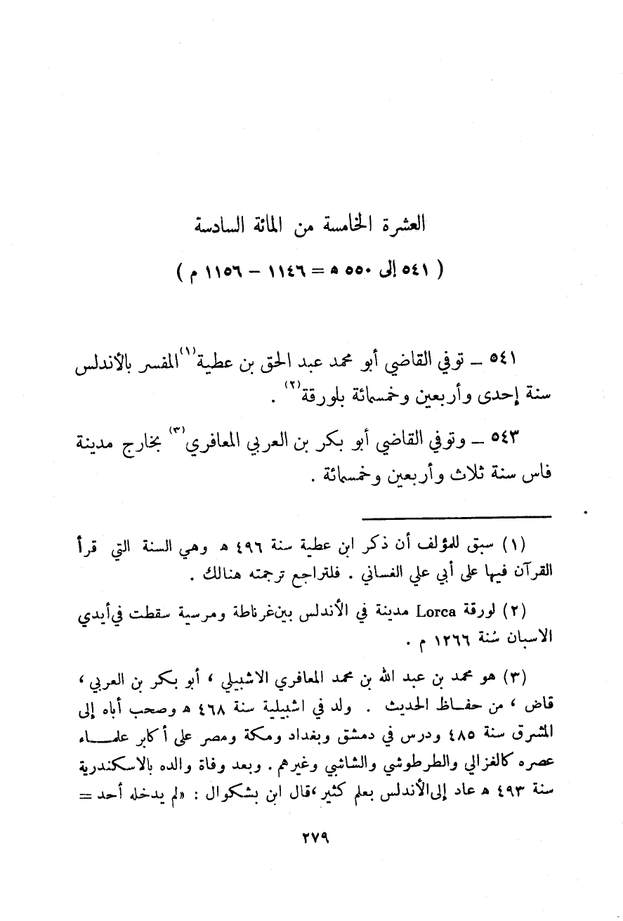 541 - إلى 550 - 1146 - 1156م توفي القاضي أبو محمد عبد الحق بن عطية المفسر بالأندلس سنة إحدى وأربعين وخمسمائة بلورقة.