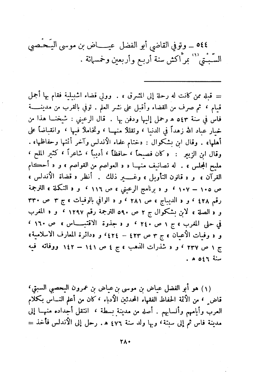 وتوفي القاضي أبو الفضل عياض بن موسى اليحصبي السبتي بمراكش سنة أربع وأربعين وخمسمائة.