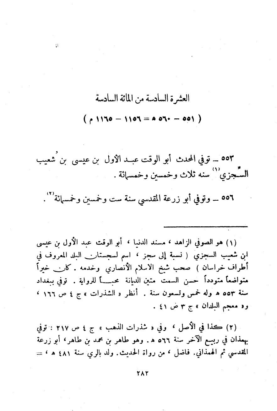 551 - 560هـ، 1156 - 1165 م توفي المحدث أبو الوقت عبد الأول بن عيسى بن شعيب السجزي سنه ثلاث وخمسين وخمسمائة.