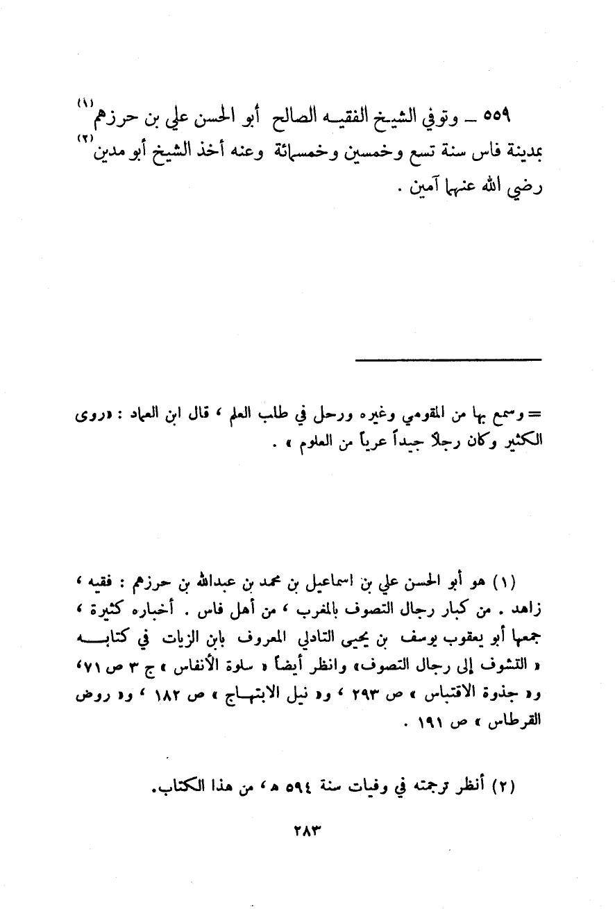 وتوفي الشيخ الفقيه الصالح أبو الحسن علي بن حرزهم بمدينة فاس سنة تسع وخمسين وخمسمائة وعنه أخذ الشيخ أبو مدين رضي الله عنهما آمين.