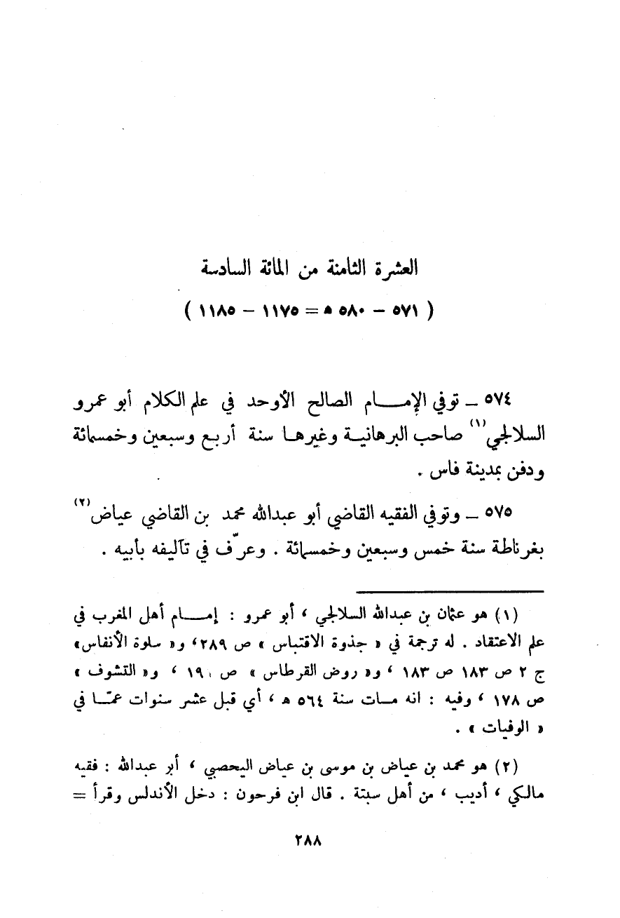 571 - 580هـ، 1175 - 1185 توفي الإمام الصالح الأوحد في علم الكلام أبو عمرو السلالجي صاحب البرهانية وغيرها سنة أربع وسبعين وخمسمائة ودفن بمدينة فاس.