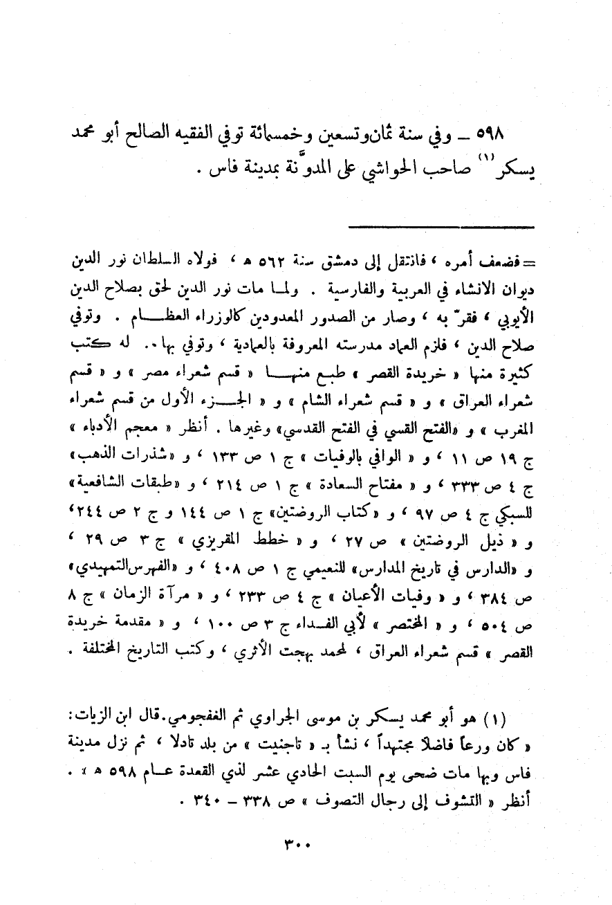 وفي سنة ثمان وتسعين وخمسمائة توفي الفقيه الصالح أبو محمد يسكر صاحب الحواشي على المدونة بمدينة فاس.