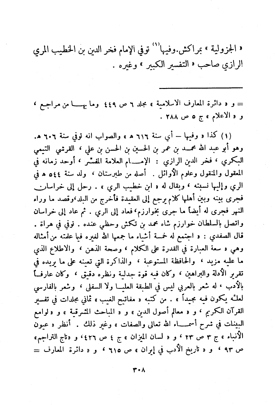 الجزولية بمراكش. وفيها توفي الإمام فخر الدين بن الخطيب المري الرازي صاب التفسير الكبير وغيره.