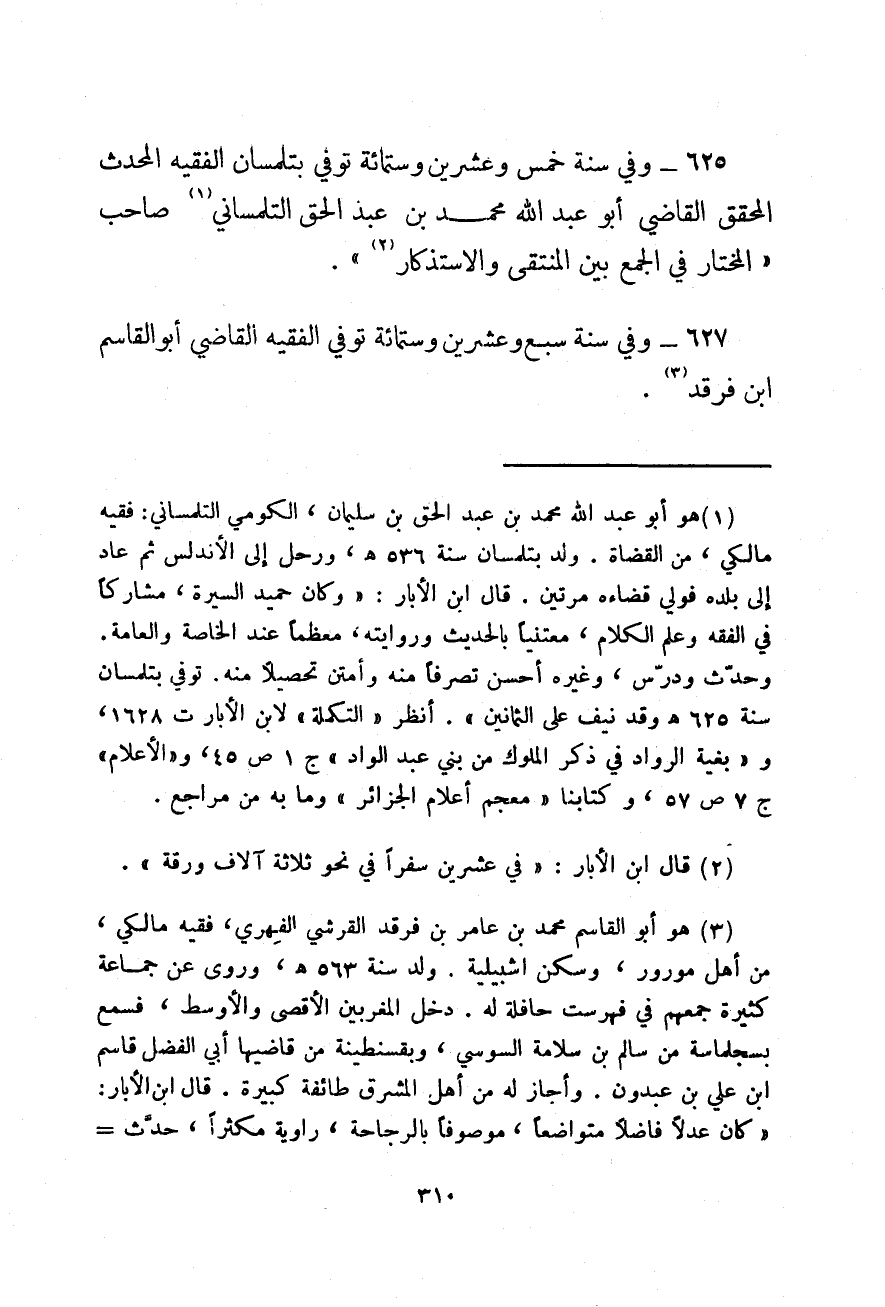 وفي سنة خمس وعشرين وستمائة توفي بتلمسان الفقيه المحدث المحقق القاضي أبو عبد الله محمد بن عبد الحق التلمساني صاحب المختار في الجمع بين المنتقى والاستذكار.