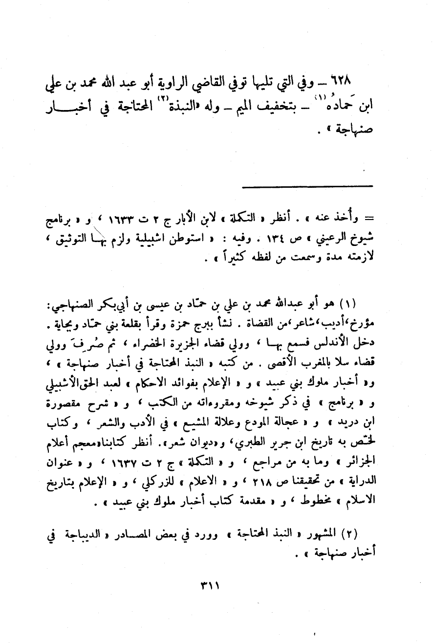 وفي التي تليها توفي القاضي الراوية أبو عبد الله محمد بن علي ابن حَمادُه - بتخفيف الميم - وله النبذة المحتاجة في أخبار صنهاجة.