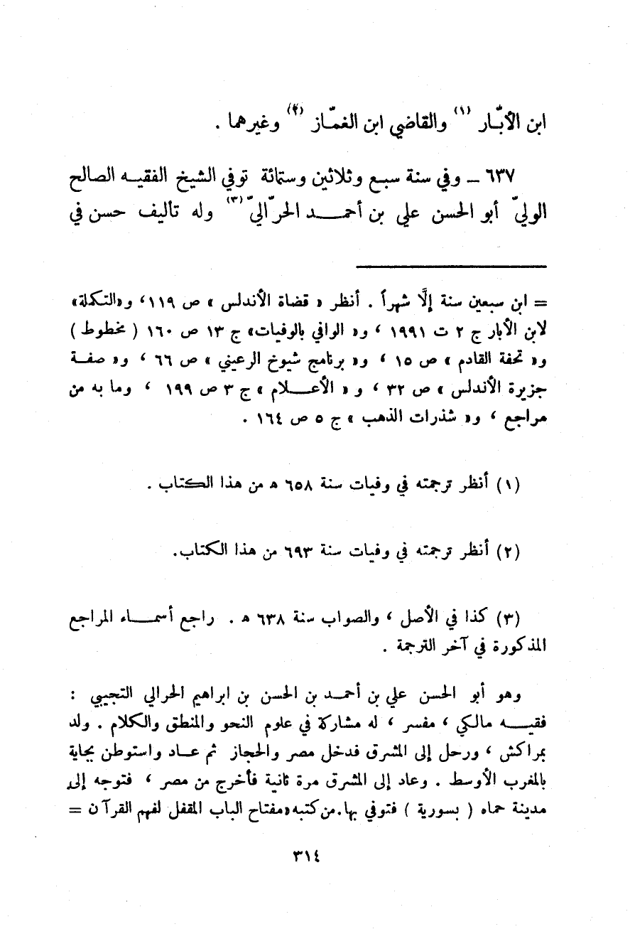 وفي سنة سبع وثلاثين وستمائة توفي الشيخ الفقيه الصالح الولي أبو الحسن علي بن أحمد الحرالي وله تأليف حسن في