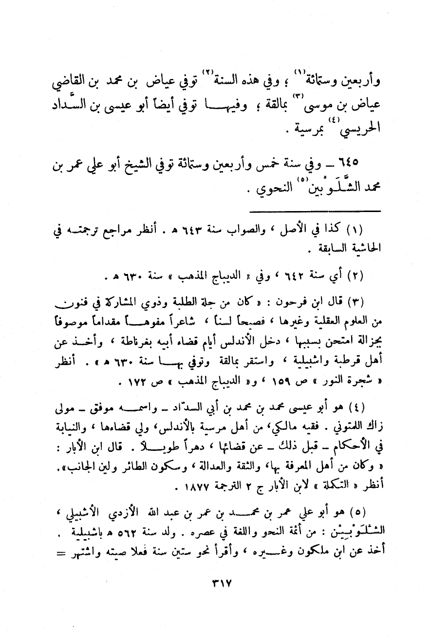 وأربعين وستمائة؛ وفي هذه السنة توفي عياض بن محمد بن القاضي عياض بن موسى بمالقة؛ وفيها توفي أيضاً أبو عيسى بن السداد الحريسي بمرسية.