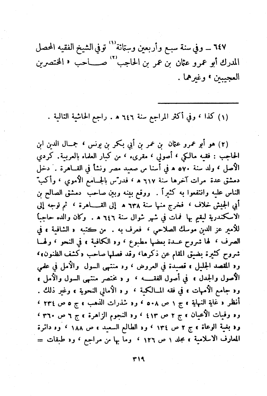 وفي سنة سبع وأربعين وستمائة توفي الشيخ الفقيه المحصل المدرك أبو عمرو عثمان بن عمر بن الحاجب صاحب المختصرين العجيبين وغيرهما.
