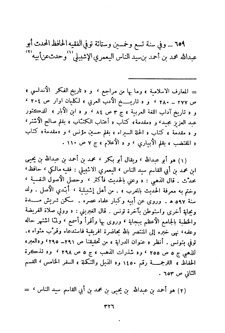 وفي سنة تسع وخمسين وستمائة توفي الفقيه الحافظ المحدث أبو عبد الله محمد بن أحمد بن سيد الناس اليعمري الإشبيلي وحدث عن أبيه