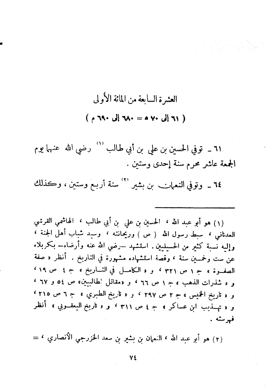 61 - إلى 70هـ، 680 إلى 690م توفي الحسين بن علي بن أبي طالب رضي الله عنهما يوم الجمعة عاشر محرم سنة إحدى وستين.