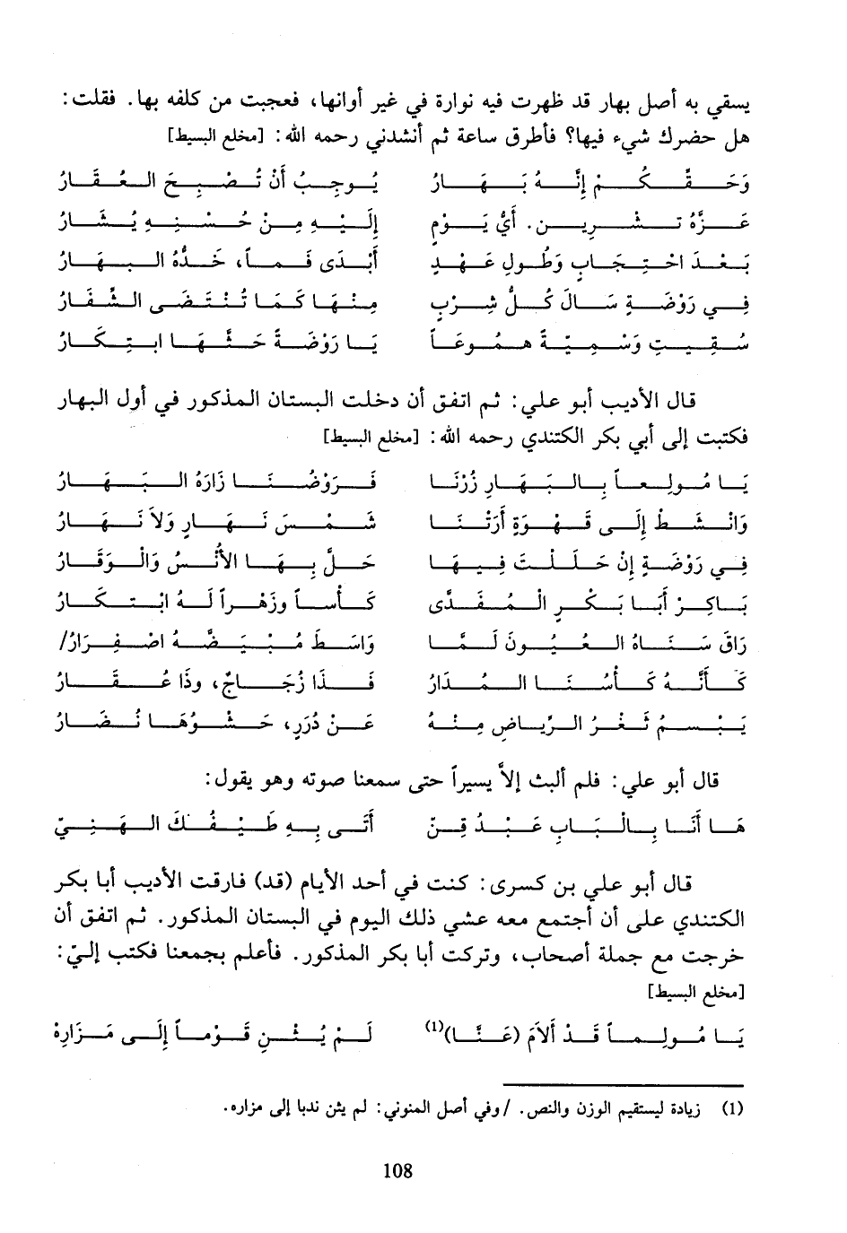 قال الأديب أبو علي: ثم اتفق أن دخلت البستان المذكور في أول البهار فكتبت إلى أبي بكر الكتندي رحمه الله: [مخلع البسيط]
